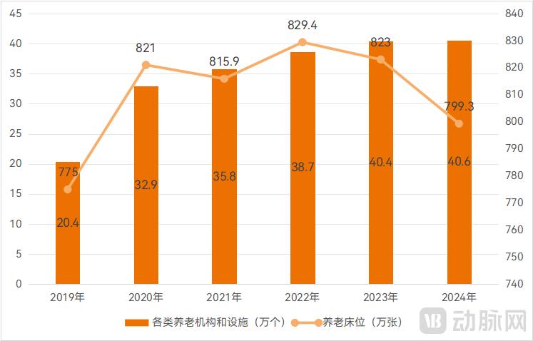 在老龄化加剧的大背景下,我国老年人口数量显著增长,而养老床位数却呈现下滑态势。据民政部、全国老龄办的统计数据显示,我国养老床位曾在2022年达到顶峰829.4万张,此后逐年下降,2024年已跌破800万张,仅有799.3万张;其中,注册登记的养老机构数及床位数在近三年里均处于下降状态。