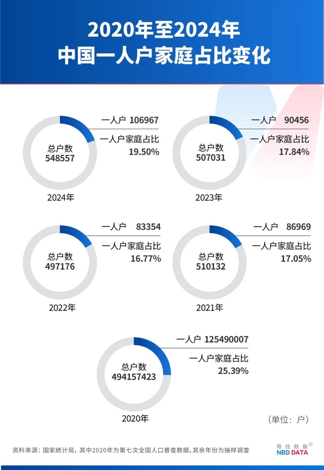 第七次全国人口普查数据显示,截至2020年底,中国一人户家庭超过1.25亿户。而根据国家统计局《中国统计年鉴》的抽样调查,2024年,中国一人户在各类家庭规模中,占比接近20%。据央广网报道,数据显示,我国空巢老人占比已达59.7%,人数突破1.8亿,其中完全独居老人数量突破3800万。