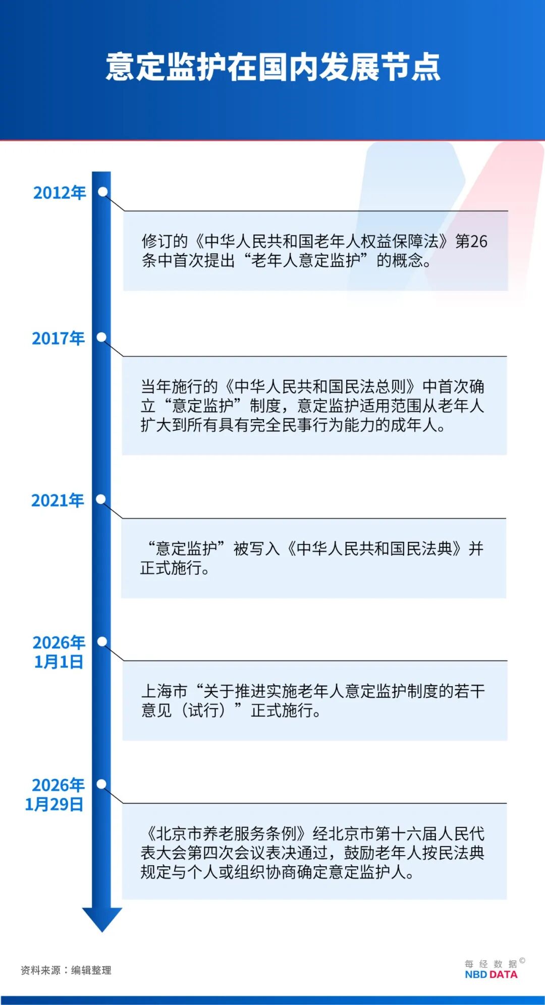 2026年1月29日,《北京市养老服务条例》经北京市第十六届人民代表大会第四次会议表决通过;上海“关于推进实施老年人意定监护制度的若干意见(试行)”也已于2026年1月1日正式施行。