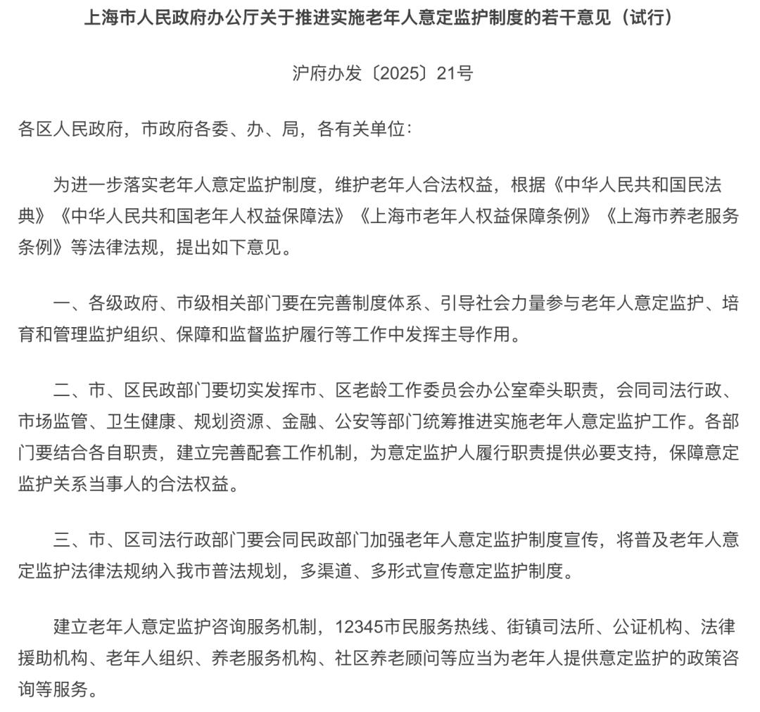 2025年12月初,上海发布“关于推进实施老年人意定监护制度的若干意见(试行)”,并于2026年1月1日正式施行。